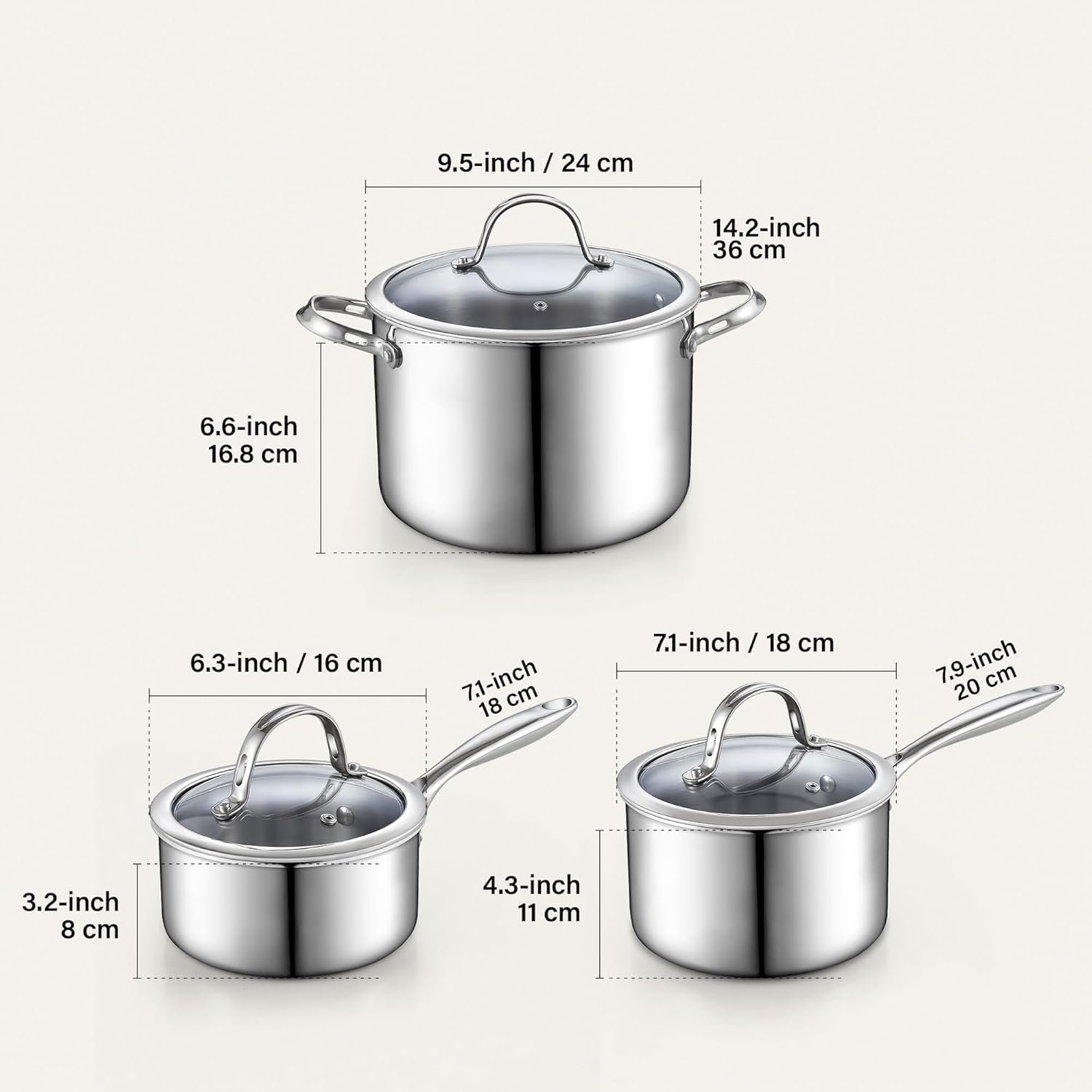 Incluye olla grande, cacerola mediana y sartén para saltear, todas con tapas de acero inoxidable y asas remachadas frías al tacto.