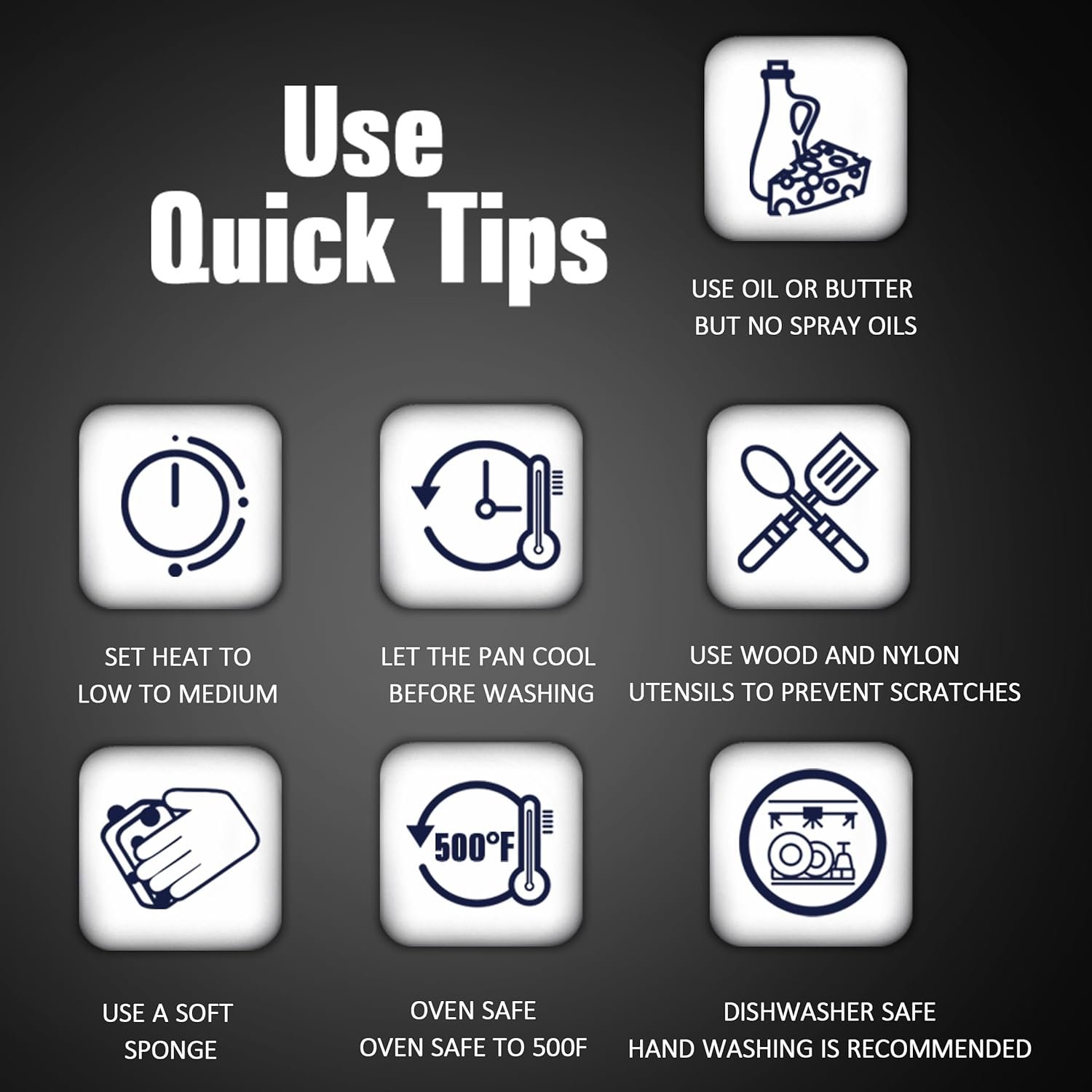 El diseño cuadrado de 11 pulgadas con líneas de parrilla permite obtener ese efecto dorado característico de los asados, ideal para carnes, vegetales y hamburguesas. Su mango de acero inoxidable remachado se mantiene frío al tacto, y el sartén es compatible con cocinas de gas, eléctricas, cerámicas y horno hasta 450 °F (232 °C).