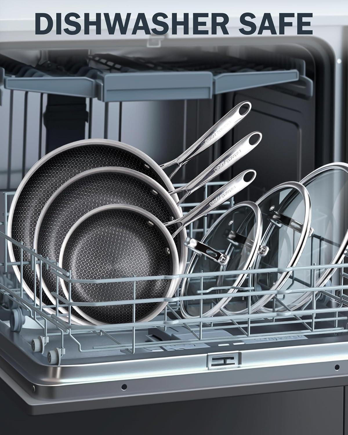 El sartén Cook’s Standard híbrido de 8 pulgadas combina lo mejor del acero inoxidable y la tecnología antiadherente moderna. Su superficie tipo panal hexagonal permite cocinar sin que los alimentos se peguen, manteniendo una textura crujiente y un dorado perfecto.