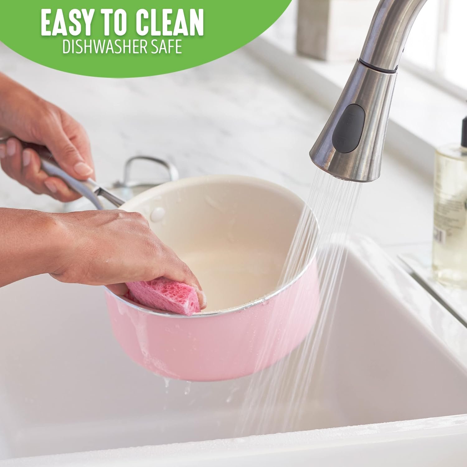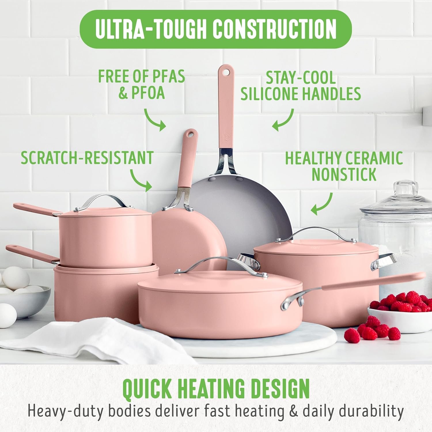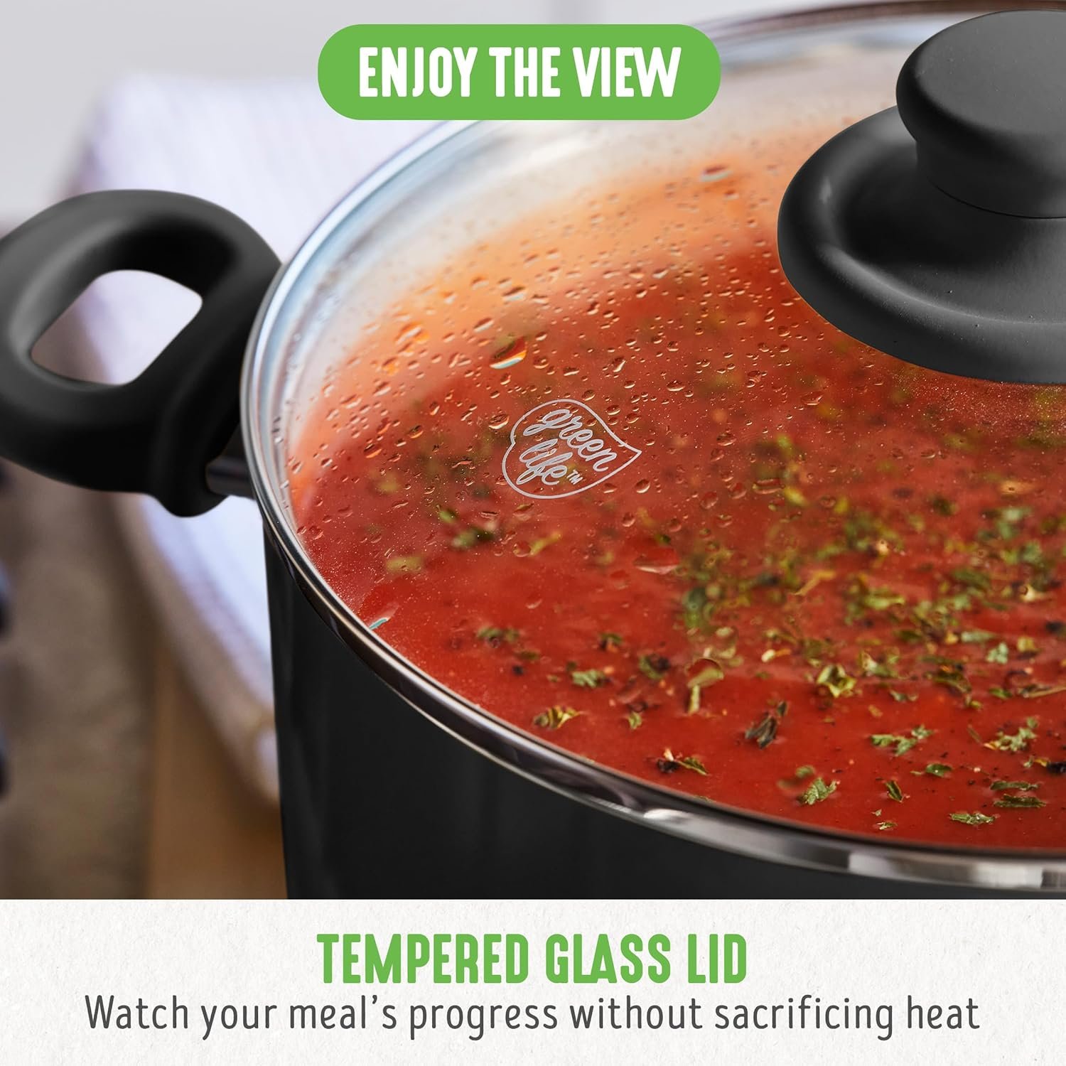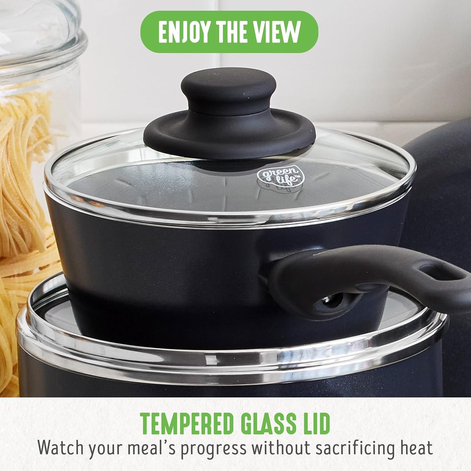 Las ollas GreenLife están fabricadas con aluminio ligero y un recubrimiento cerámico Thermolon™ libre de PFOA, PFAS, plomo y cadmio, lo que garantiza una cocción segura y saludable.