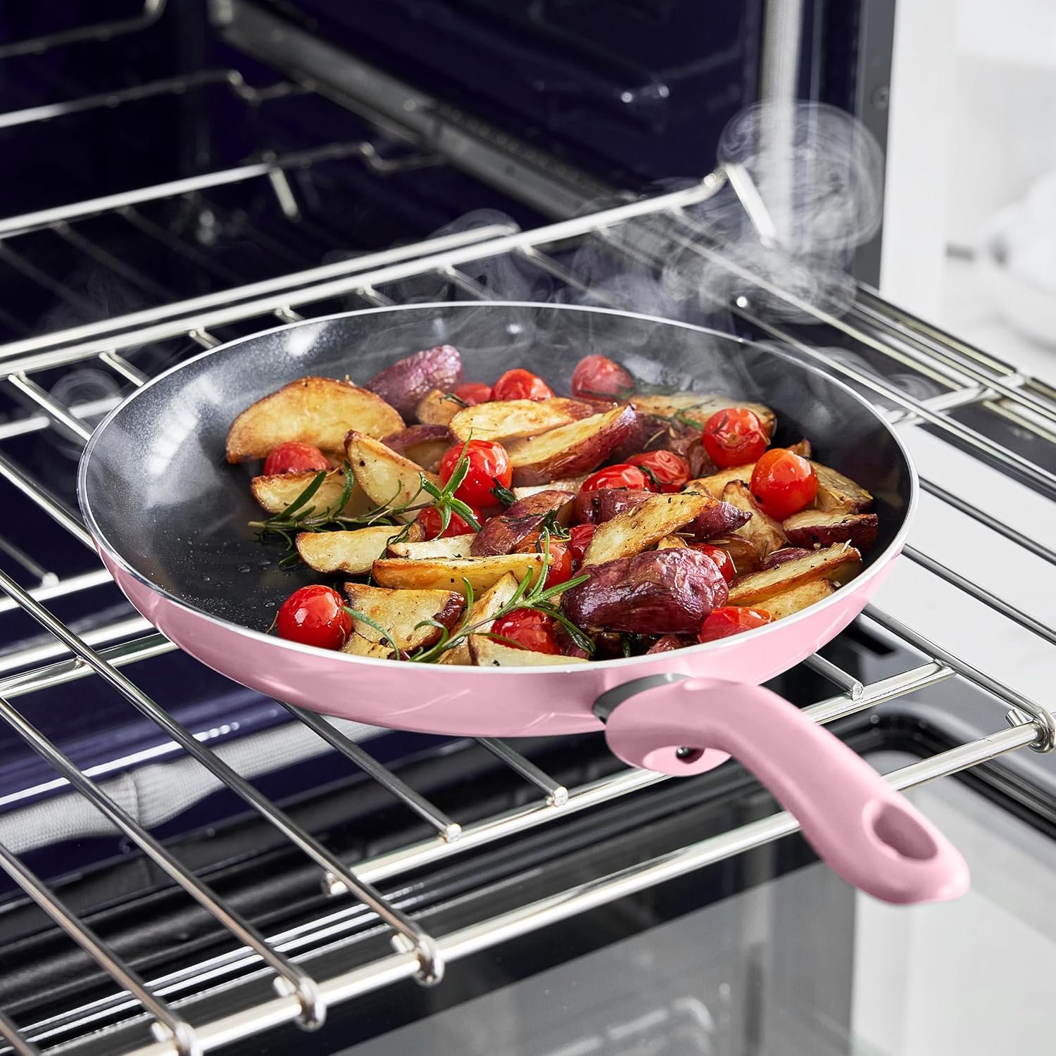 Libre de PFAS, PFOA, plomo y cadmio, con asas de silicona Soft Grip que ofrecen un agarre cómodo y seguro. Su cuerpo de aluminio reforzado distribuye el calor de forma uniforme, mientras que el interior cerámico garantiza una cocina saludable, práctica y sin esfuerzo.