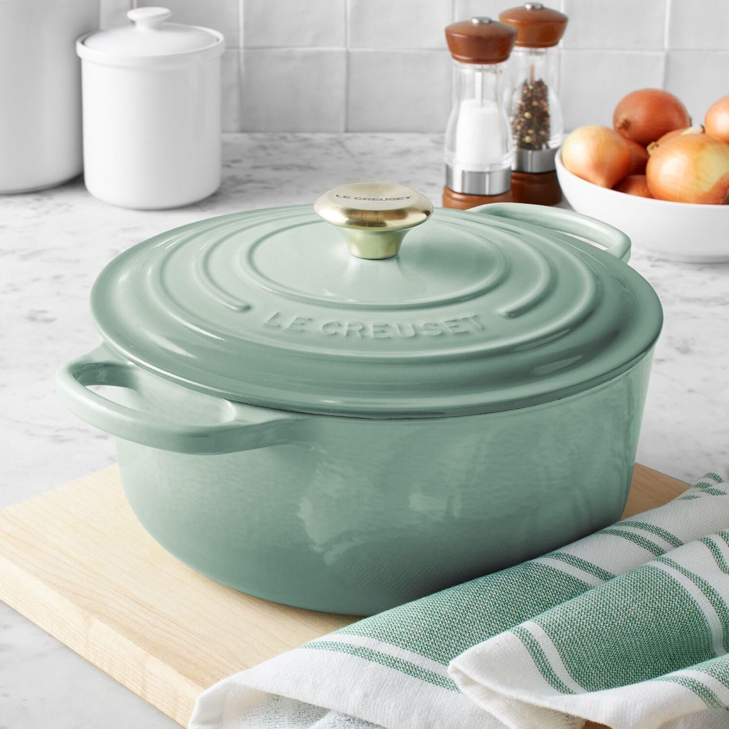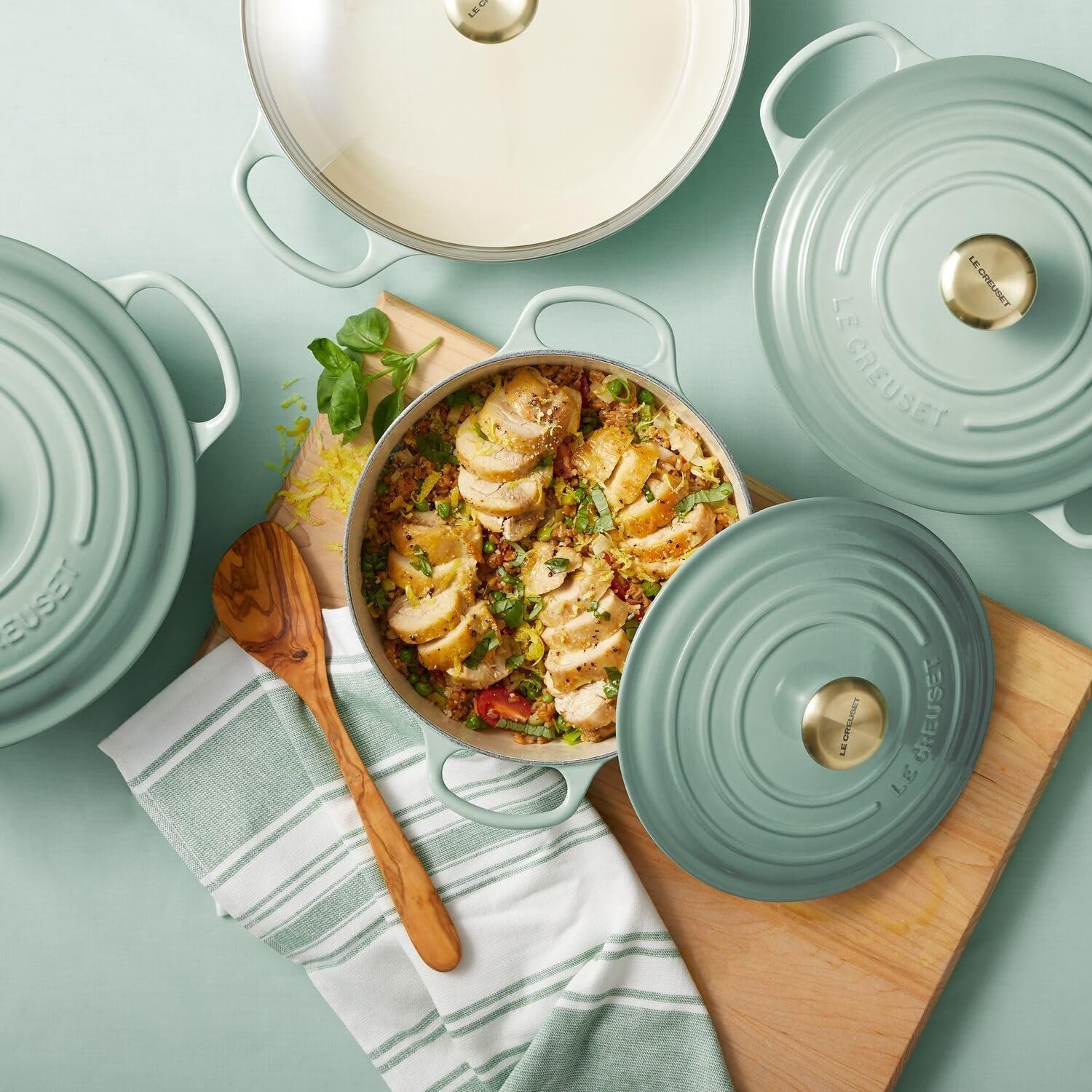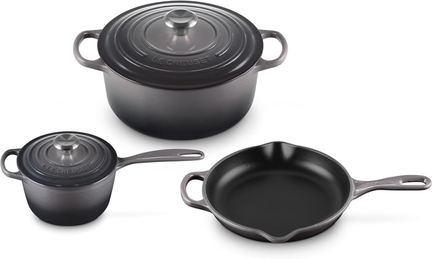 Ollas Le Creuset Signature color Oyster – Juego de 9 piezas de hierro fundido