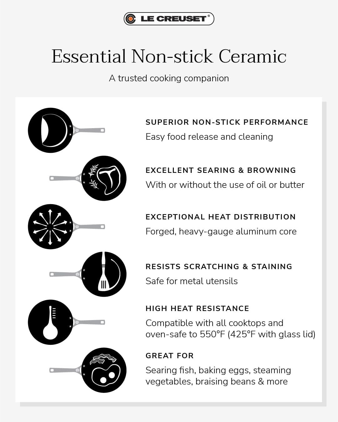 - Nota: Aunque estos utensilios Le Creuset garantizan un rendimiento antiadherente superior, el recubrimiento puede deteriorarse con el uso normal a lo largo de los años. Si buscas una opción que conserve sus propiedades de por vida, te recomendamos explorar sus líneas de hierro fundido esmaltado o acero inoxidable multicapa.