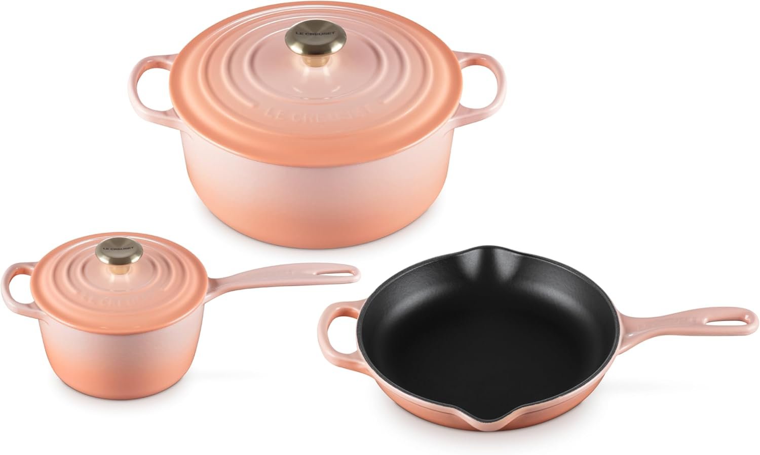 El paquete de 5 piezas Le Creuset Signature combina hierro fundido esmaltado, sartenes antiadherentes y accesorios de cerámica de alta calidad. Cada componente está diseñado para distribuir el calor de manera uniforme, resistir altas temperaturas y facilitar la limpieza.