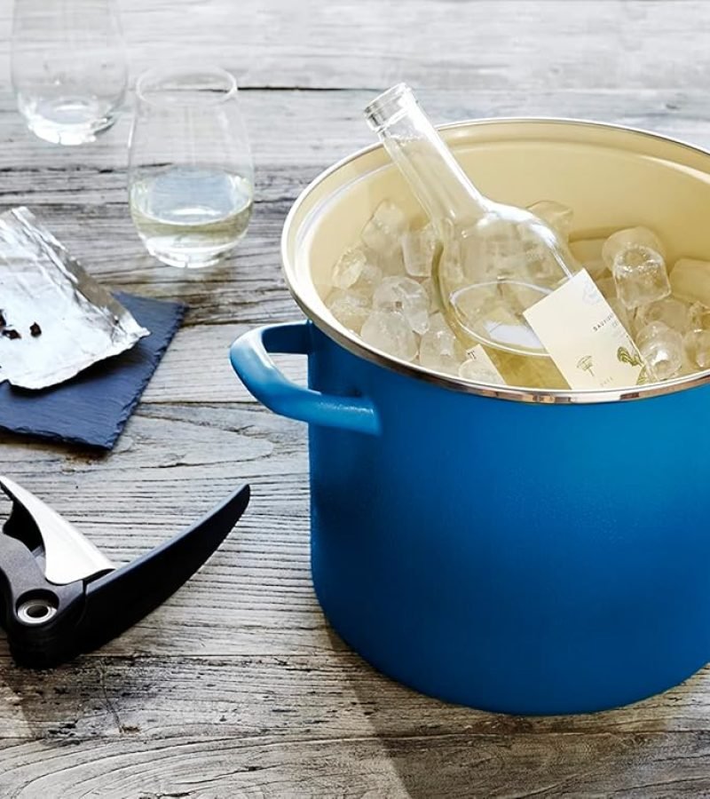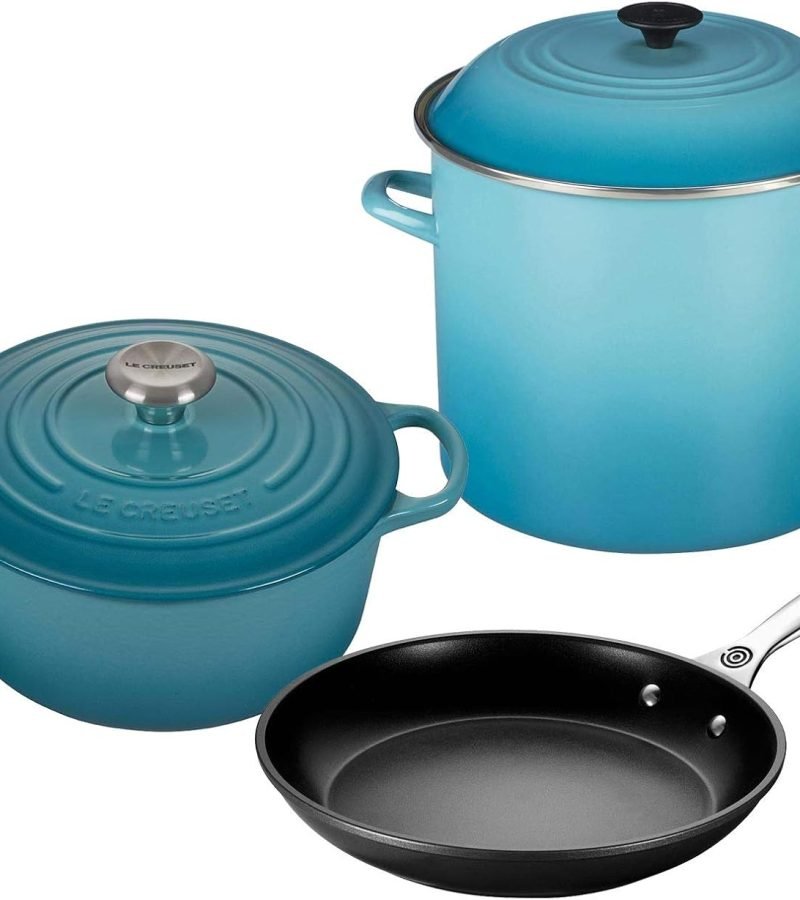 El juego de 20 piezas Le Creuset Caribbean incluye cacerolas de hierro fundido esmaltado, sartenes antiadherentes y utensilios de silicona resistentes. Su diseño asegura una cocción uniforme y fácil limpieza, destacándose por su durabilidad y por el vibrante tono Caribbean que aporta estilo a la cocina.