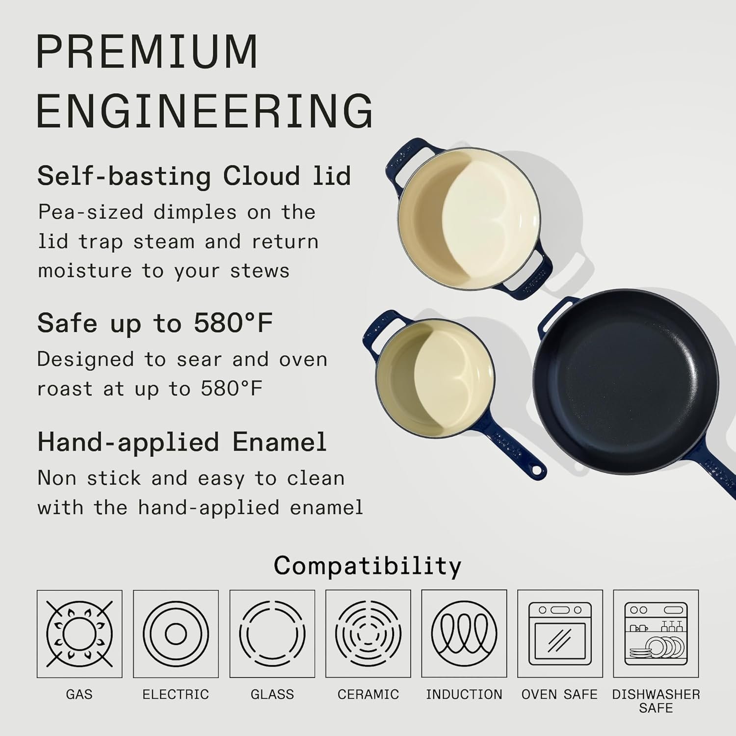 El set de Made In Cookware incluye 5 piezas de hierro fundido esmaltado en color azul, ideales para cocinar con máxima retención de calor y durabilidad. Contiene horno holandés con tapa, sartén y cacerola con tapa, perfectos para guisos, panes y recetas de cocción lenta con un acabado elegante y profesional.