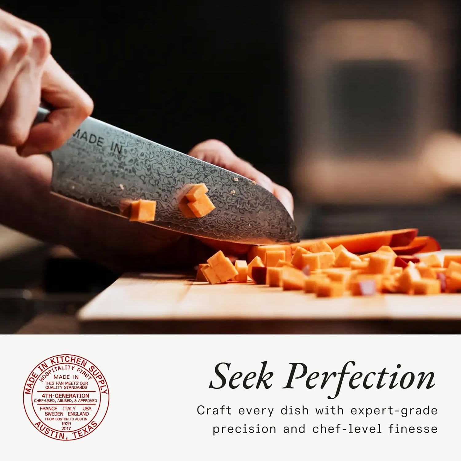 El set japonés de Made In Cookware incluye cuchillos Gyuto, Nakiri y Santoku, elaborados con 66 capas de acero de Damasco y núcleo VG-10. Fabricados en Japón con técnicas tradicionales, ofrecen un filo ultra resistente, precisión en cada corte y una estética única con patrón de Damasco. Son el complemento ideal para chefs y amantes de la cocina que buscan herramientas de máxima calidad.