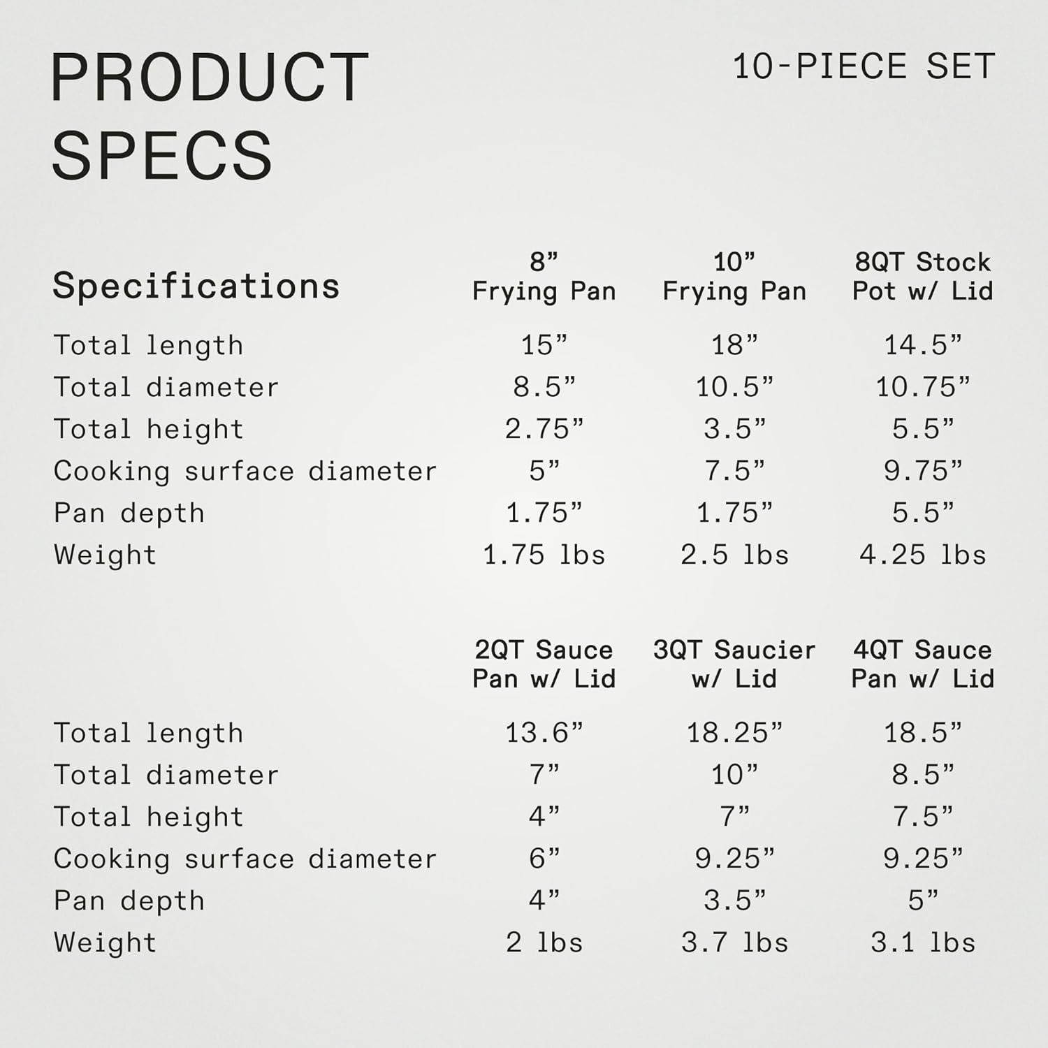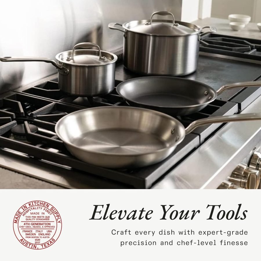 ste set de Made In Cookware incluye 10 piezas de acero inoxidable multicapa (5-ply) que garantizan una distribución uniforme del calor y máxima durabilidad. Contiene sartenes, cacerolas, olla con tapa y sartén sauté, ideales para cocinar con calidad profesional en cualquier tipo de cocina, incluyendo inducción.