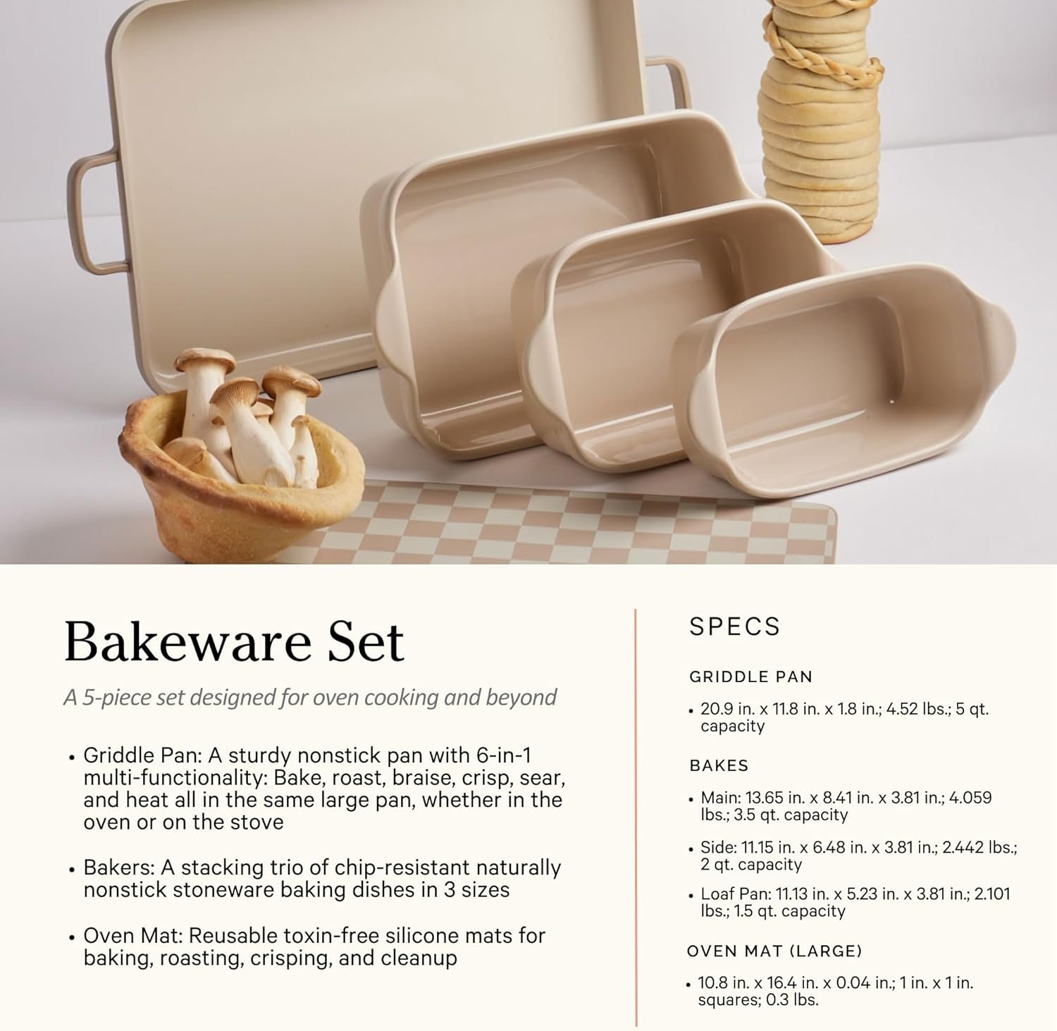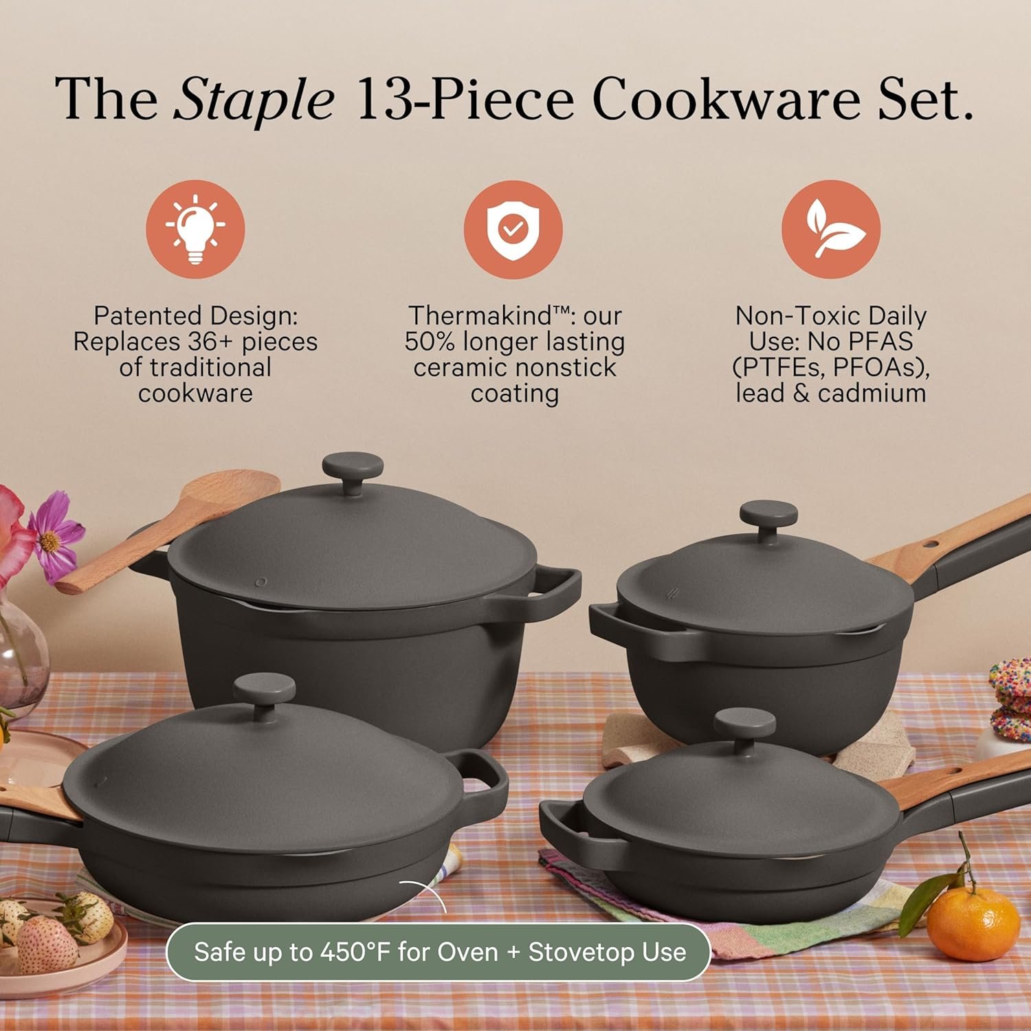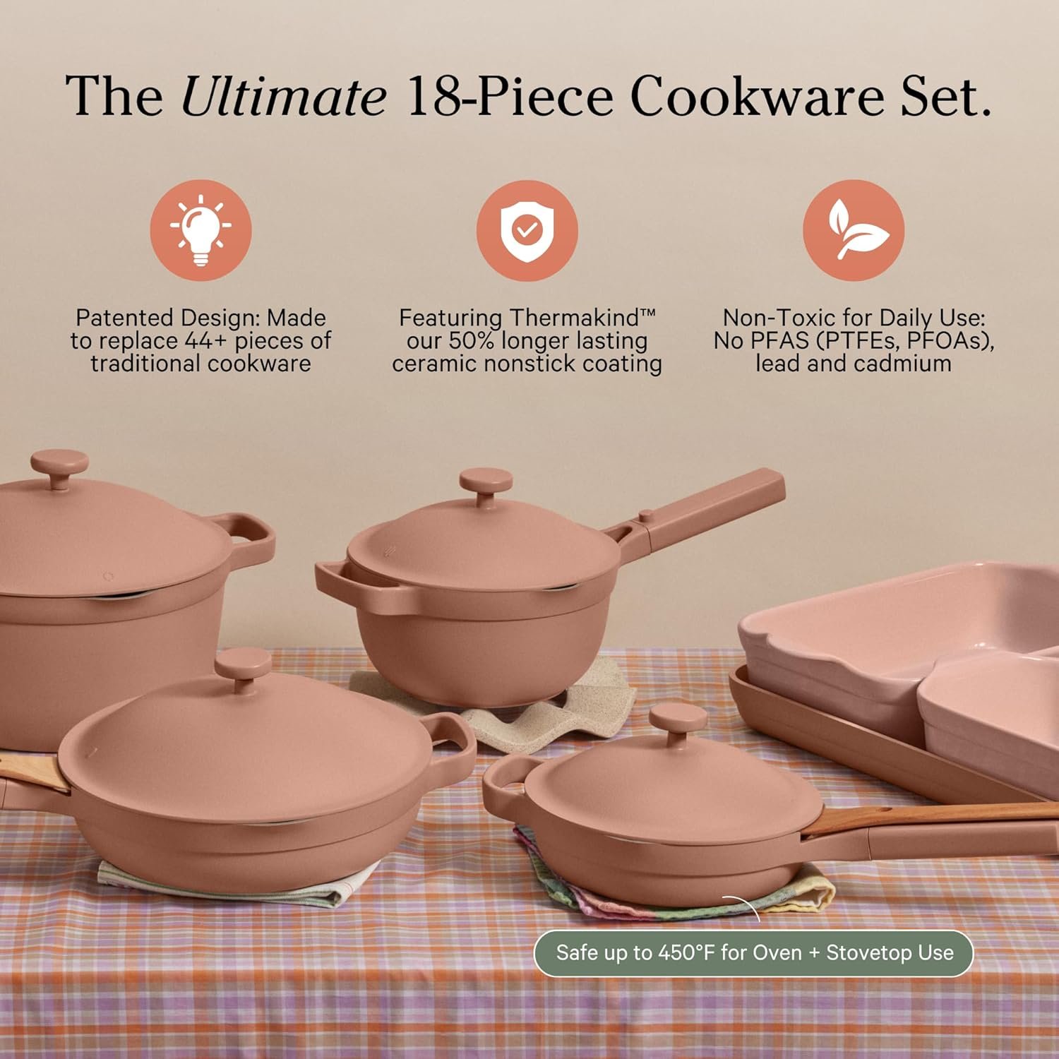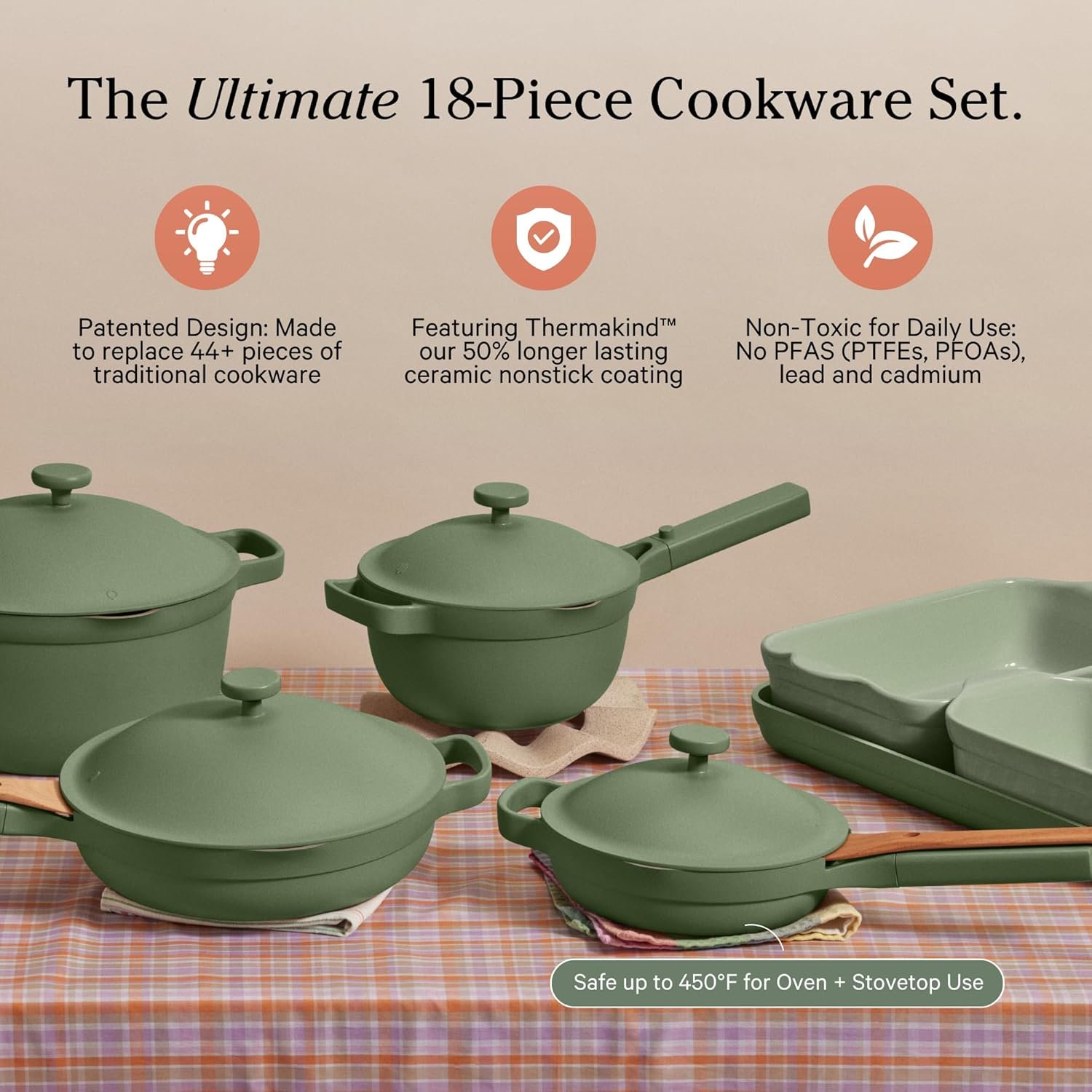 Incluye la Always Pan, la Perfect Pot, utensilios de cocina y bandejas de horneado, todas elaboradas con recubrimiento cerámico libre de tóxicos, ideal para cocinar de forma más natural y segura.