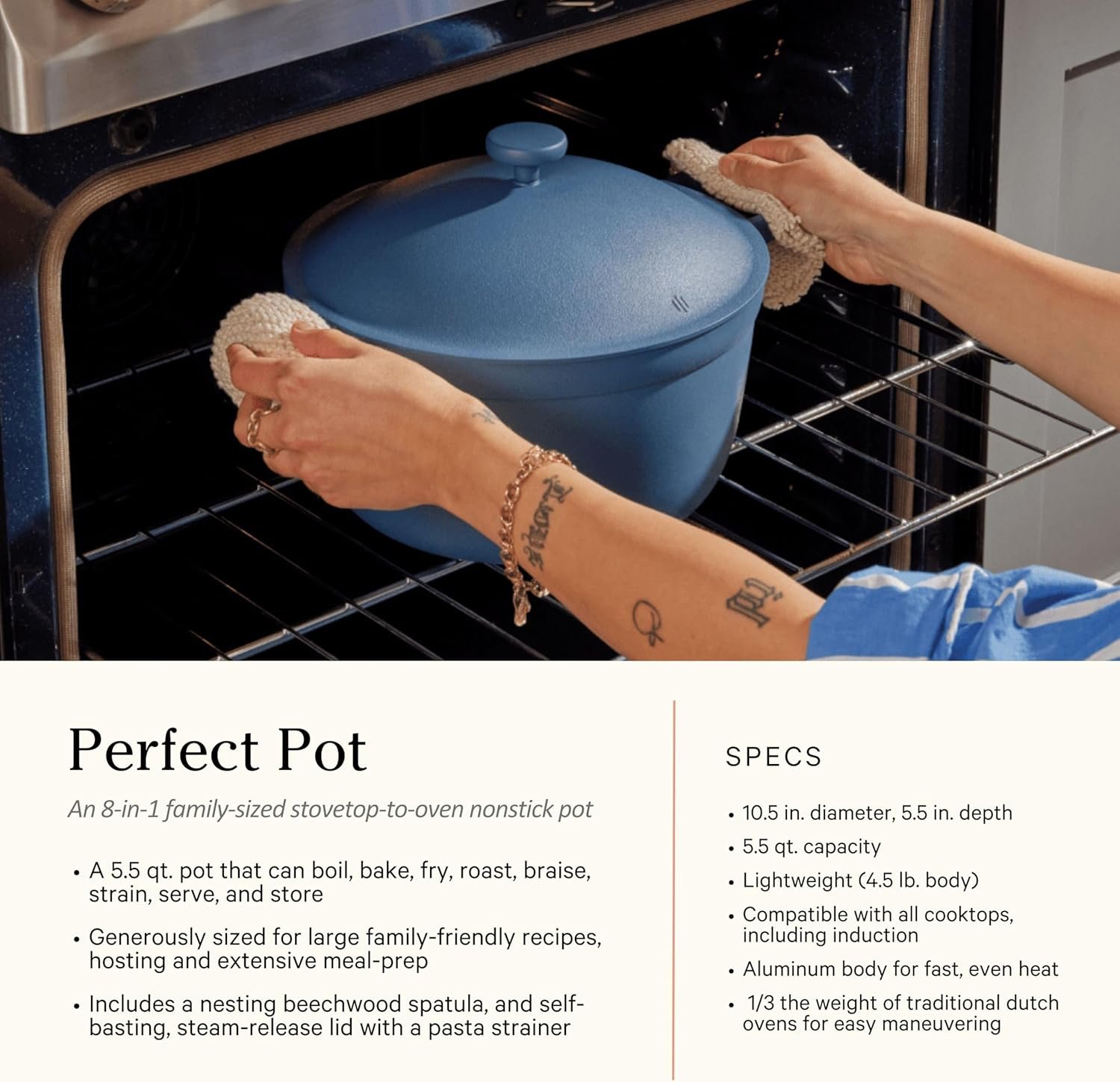 Resiste temperaturas de hasta 450 °F (230 °C) y es compatible con horno y estufa, ofreciendo una experiencia práctica, duradera y moderna con la calidad que caracteriza a las ollas Our Place.