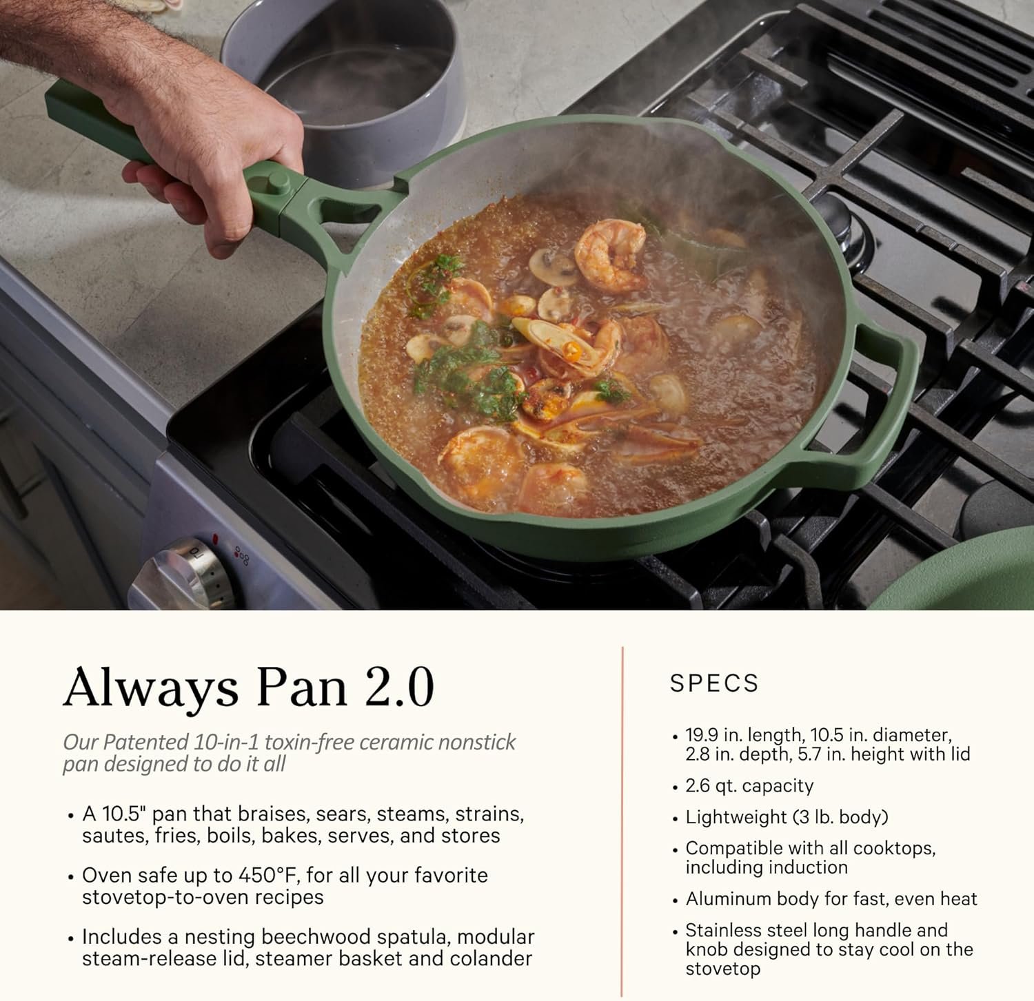 Incluye la Always Pan, la Perfect Pot, utensilios y bandejas de horneado elaborados con un recubrimiento cerámico libre de tóxicos, ideal para cocinar de manera segura y conservar el sabor natural de los alimentos.