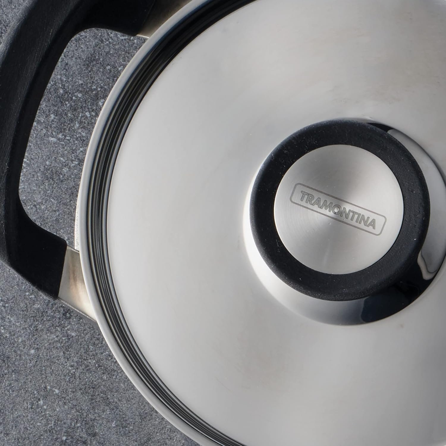 Las asas de acero inoxidable sólido, remachadas y ergonómicas, aseguran un agarre firme y cómodo, brindando seguridad durante el uso diario. Este equilibrio entre estética moderna y practicidad convierte a Tramontina en una opción confiable para quienes buscan comodidad, durabilidad y elegancia en su cocina.