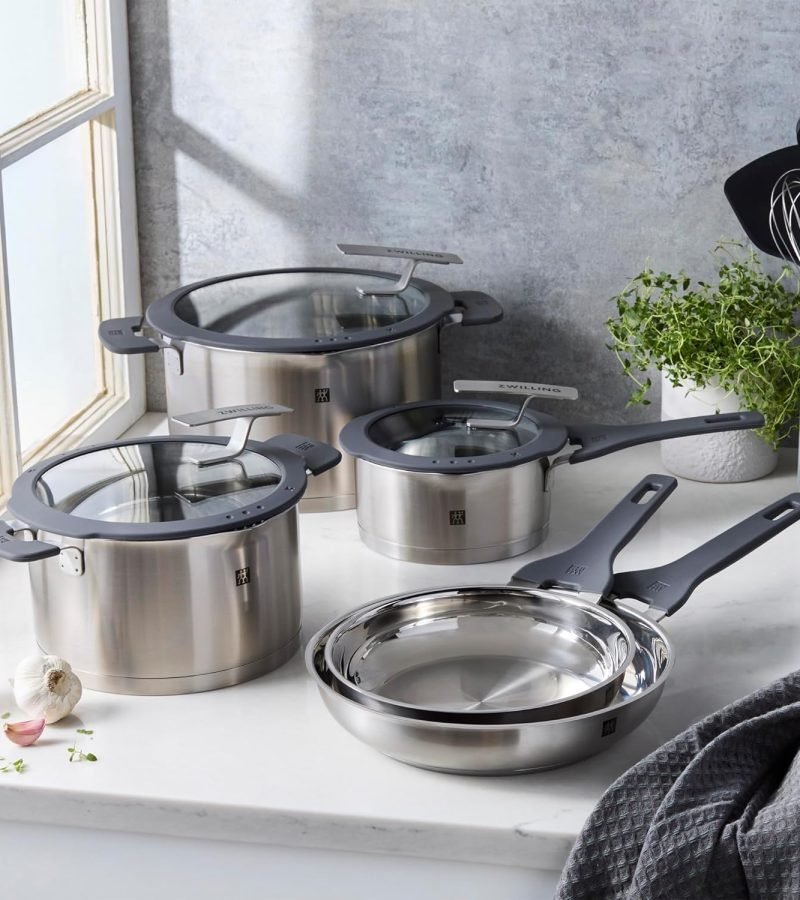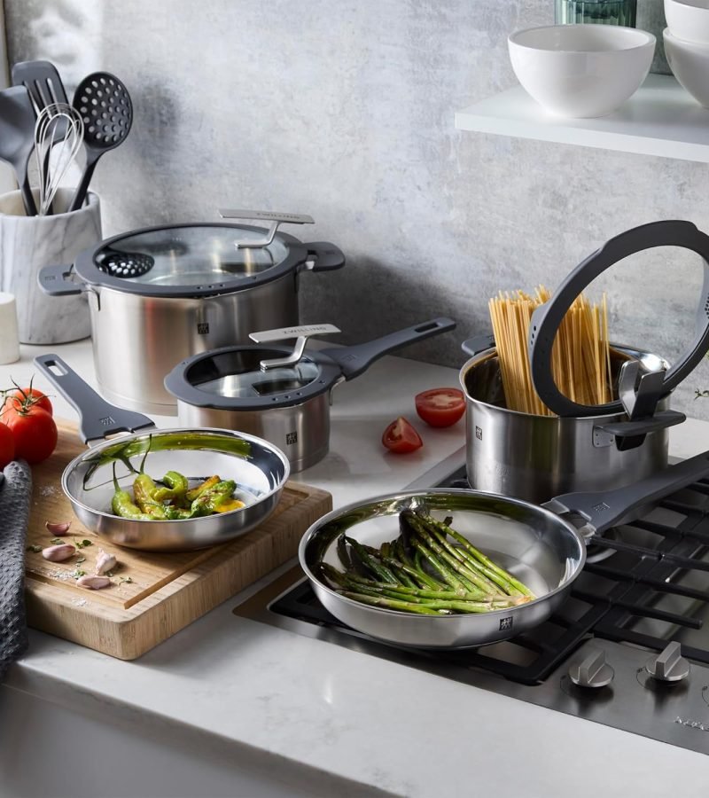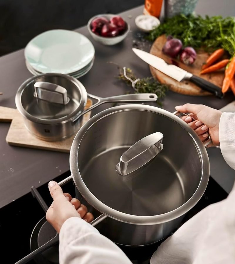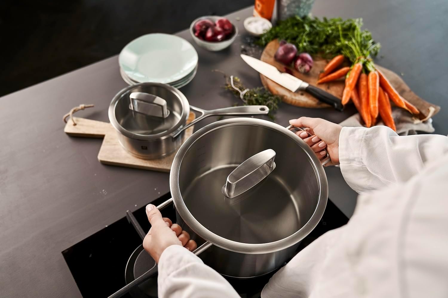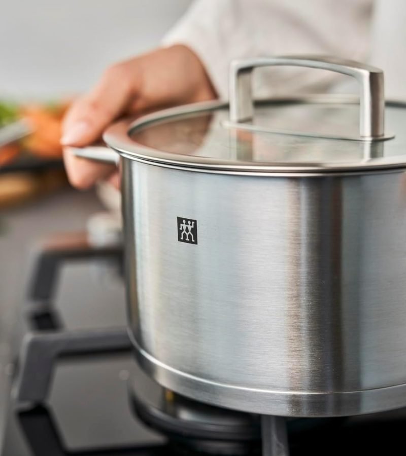 Según la colección, incorporan tapaderas de vidrio templado o acero inoxidable, diseñadas para mantener el calor y permitir un control visual de los alimentos. En algunas líneas, Zwilling añade innovaciones como bordes antigoteo o sellos de silicona que aportan practicidad al uso diario.